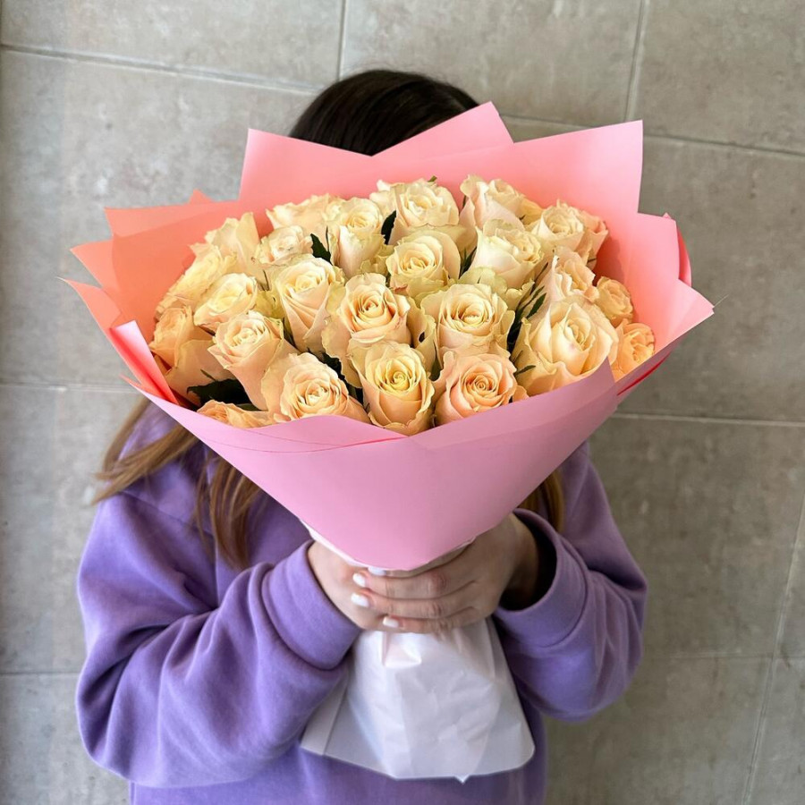 На фото букет из 29 кремовых роз. В составе: роза 29 шт, дизайнерская упаковка 1 шт, атласная лента 1 шт, . Все цветы свежие и ароматные, букет красиво оформлен и отлично подходит для подарка. Доступна доставка цветов или самовывоз.