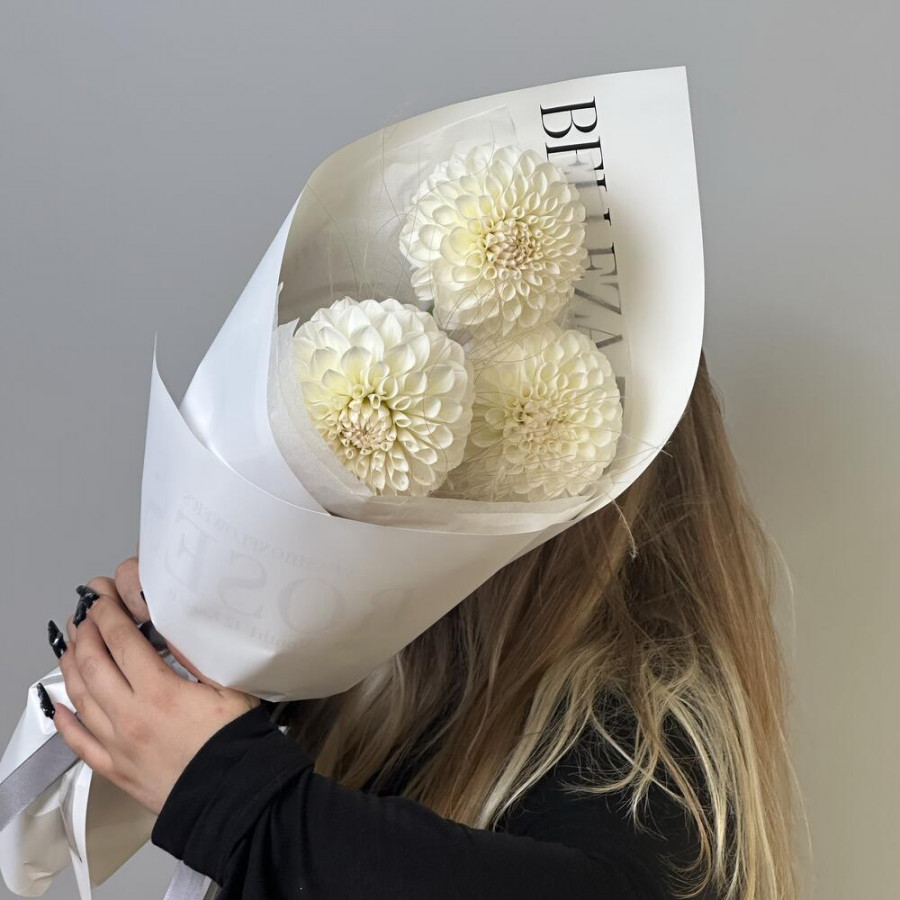 На фото букет из 3 белых георгин. В составе: георгина 3 шт, сухоцветы (микс) 2 шт, дизайнерская упаковка 1 шт, атласная лента 1 шт, . Все цветы свежие и ароматные, букет красиво оформлен и отлично подходит для подарка. Доступна доставка цветов или самовывоз.