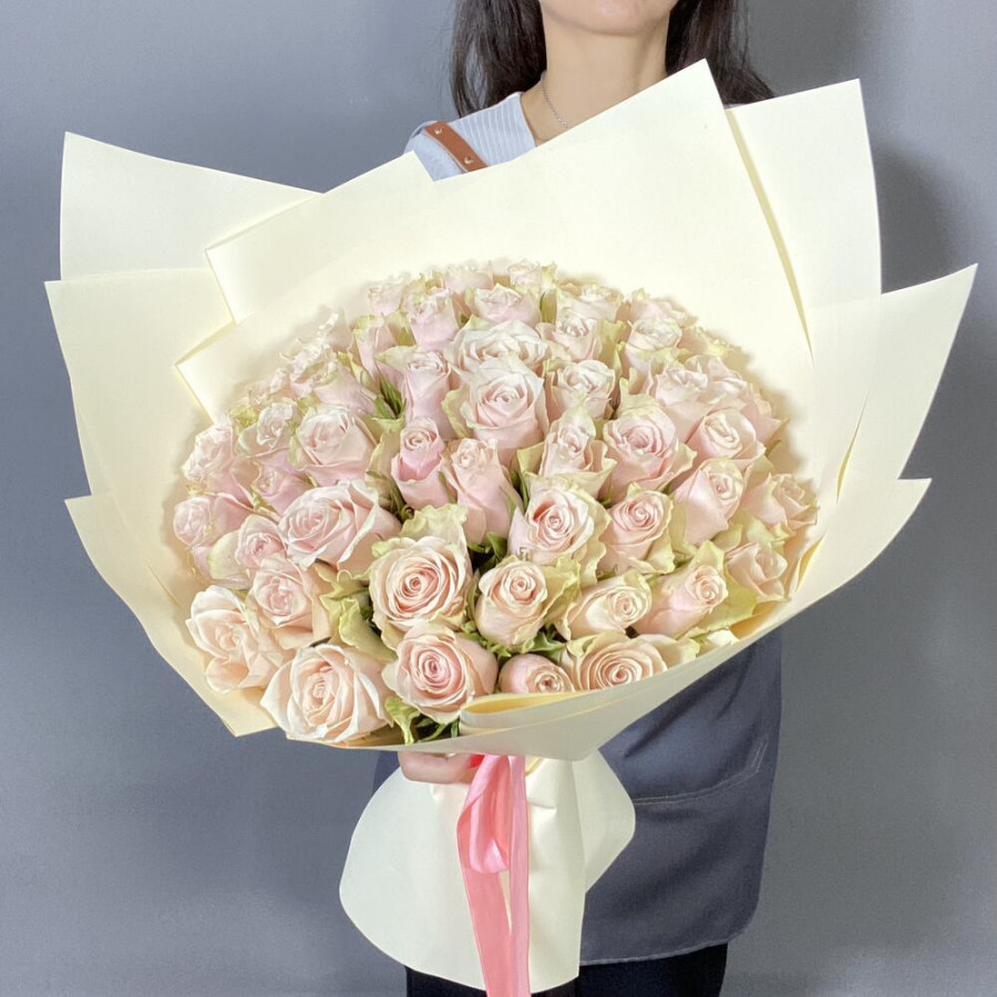 На фото букет из 51 кремовой розы. В составе: роза 51 шт, фоамиран 2 шт, атласная лента 1 шт, . Все цветы свежие и ароматные, букет красиво оформлен и отлично подходит для подарка. Доступна доставка цветов или самовывоз.